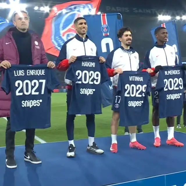 今年2月7日,巴黎圣日耳曼曾在主场举办过一个盛大的续约仪式,官宣和维蒂尼亚、阿什拉夫与努诺·门德斯续约至2029年双融优配,以及和主教练路易斯·恩里克续约至2027年。